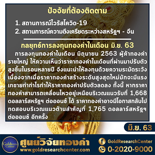 การลงทุนทองคำในเดือน มิถุนายน 2563ผู้ค้าทองคำรายใหญ่ ให้ความเห็นว่าราคาทองคำในเดือนที่ผ่านมาปรับตัวสูงขึ้นในรอบหลายปี จึงแนะนำให้ลงทุนด้วยความระมัดระวัง เนื่องจากเมื่อราคาทองคำสร้างระดับสูงสุดใหม่มักจะมีแรงเทขายทำกำไรทำให้ราคาทองคำปรับตัวลดลง ทั้งนี้ หากราคาทองคำสามารถเคลื่อนไหวอยู่เหนือบริเวณแนวรับที่ 1,668 ดอลลาร์สหรัฐฯ ต่อออนซ์ ได้ ราคาทองคำอาจมีโอกาสกลับไปทดสอบบริเวณแนวต้านสำคัญที่ 1,765 ดอลลาร์สหรัฐฯ ต่อออนซ์ อีกครั้ง