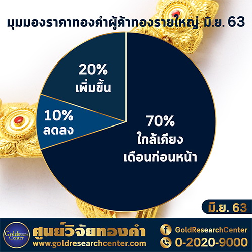 สรุปกลุ่มตัวอย่างที่เป็นผู้ประกอบกิจการค้าทองคำรายใหญ่ และผู้ประกอบกิจการนายหน้าซื้อขายสัญญาซื้อขายล่วงหน้าที่อ้างอิงกับราคาทองคำจำนวน 10 ตัวอย่าง โดยส่วนใหญ่เชื่อว่าราคาทองคำในเดือน มิถุนายน 2563 จะใกล้เคียงกับราคาทองคำในเดือน พฤษภาคม 2563 มีจำนวน 7 ราย และคาดว่าราคาทองคำจะเพิ่มขึ้น มีจำนวน 2 ราย ส่วนที่คาดว่าราคาทองคำจะลดลง มีจำนวน 1 ราย