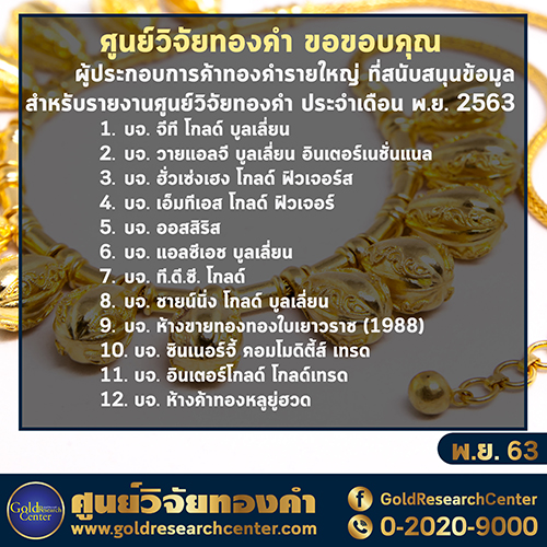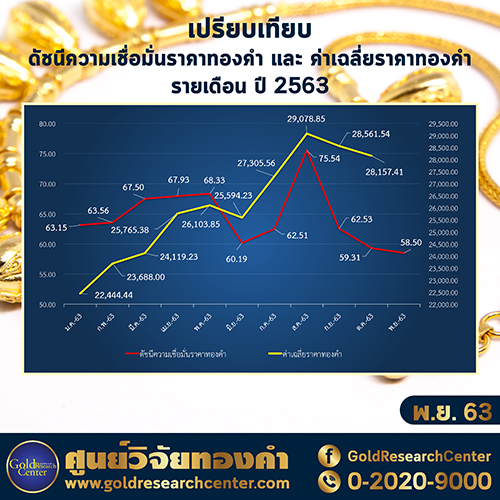 ดร.พิบูลย์ฤทธิ์ วิริยะผล แถลงดัชนีความเชื่อมั่นราคาทองคำประจำเดือน พฤศจิกายน 2563 ปรับลดลงเมื่อเทียบกับเดือน ตุลาคม 2563 ที่ผ่านมา จากระดับ 59.31จุด มาอยู่ที่ระดับ 58.50 จุด ลดลง 0.81 จุด หรือคิดเป็น 1.37% โดยปัจจัยที่ทำให้ดัชนีฯ ปรับลดลงมานั้น น่าจะมีสาเหตุมาจากแรงขายทองคำจากธนาคารกลางของประเทศต่าง ๆ ทั่วโลก การพัฒนาและคิดค้นวัคซีนต้านไวรัส COVID-19 สัญญาณการฟื้นตัวของเศรษฐกิจโลก สถานการณ์การเลือกตั้งในสหรัฐฯ และแรงขายเก็งกำไรของกองทุน