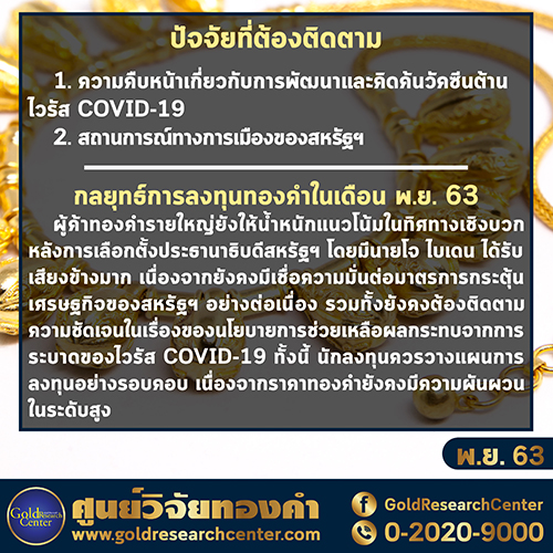 การลงทุนทองคำในเดือน พฤศจิกายน 2563 ผู้ค้าทองคำรายใหญ่ยังให้น้ำหนักแนวโน้มในทิศทางเชิงบวกหลังการเลือกตั้งประธานาธิบดีสหรัฐฯ โดยมีนายโจ ไบเดน ได้รับเสียงข้างมาก เนื่องจากยังคงมีเชื่อความมั่นต่อมาตรการกระตุ้นเศรษฐกิจของสหรัฐฯ อย่างต่อเนื่อง รวมทั้งยังคงต้องติดตามความชัดเจนในเรื่องของนโยบายการช่วยเหลือผลกระทบจากการระบาดของไวรัส COVID-19 ทั้งนี้ นักลงทุนควรวางแผนการลงทุนอย่างรอบคอบ เนื่องจากราคาทองคำยังคงมีความผันผวนในระดับสูง
