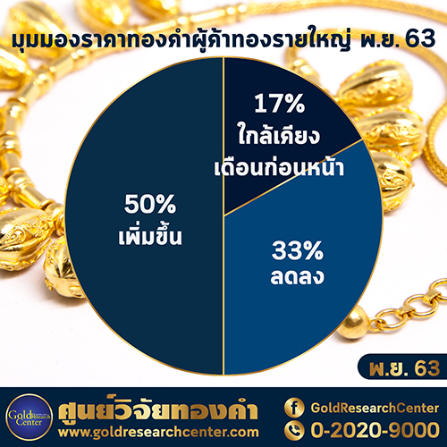 สรุปกลุ่มตัวอย่างที่เป็นผู้ประกอบกิจการค้าทองคำรายใหญ่และผู้ประกอบกิจการนายหน้าซื้อขายสัญญาซื้อขายล่วงหน้าที่อ้างอิงกับราคาทองคำ จำนวน 12 ตัวอย่าง โดยส่วนใหญ่เชื่อว่าราคาทองคำในเดือน พฤศจิกายน 2563 จะเพิ่มขึ้น จำนวน 6 ราย และคาดว่าจะลดลง มีจำนวน 4 ราย ส่วนที่คาดว่าจะใกล้เคียงกับราคาทองคำในเดือน ตุลาคม 2563 มีจำนวน 2 ราย