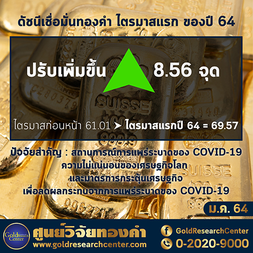 ดัชนีความเชื่อมั่นราคาทองคำระยะสามเดือนในไตรมาสแรกของปี 2564 (ม.ค.–มี.ค.) ปรับเพิ่มขึ้นจากไตรมาสสุดท้าย ของปี 2563 จากระดับ 61.01 จุด มาอยู่ที่ระดับ 69.57 จุด เพิ่มขึ้น 8.56 จุด หรือคิดเป็น 14.02% โดยดัชนีฯ ที่ปรับเพิ่มขึ้นมานั้น น่าจะมีสาเหตุมาจาก สถานการณ์การแพร่ระบาดของ COVID-19 ความไม่แน่นอนของเศรษฐกิจโลก และมาตรการกระตุ้นเศรษฐกิจเพื่อลดผลกระทบจากการแพร่ระบาดของ COVID-19