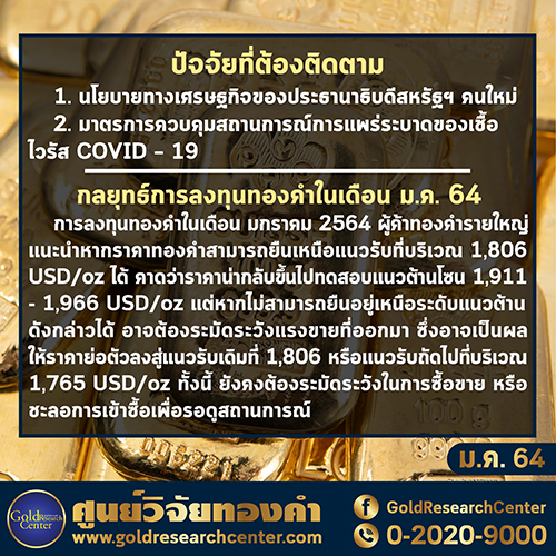 การลงทุนทองคำในเดือน มกราคม 2564ผู้ค้าทองคำรายใหญ่แนะนำหากราคาทองคำสามารถยืนเหนือแนวรับที่บริเวณ 1,806 ดอลลาร์สหรัฐฯ ต่อออนซ์ ได้ คาดว่าราคาน่ากลับขึ้นไปทดสอบแนวต้านโซน 1,911 – 1,966 ดอลลาร์สหรัฐฯ ต่อออนซ์ แต่หากไม่สามารถยืนอยู่เหนือระดับแนวต้านดังกล่าวได้ อาจต้องระมัดระวังแรงขายที่ออกมา ซึ่งอาจเป็นผลให้ราคาย่อตัวลงสู่แนวรับเดิมที่ 1,806 หรือแนวรับถัดไปที่บริเวณ 1,765 ดอลลาร์สหรัฐฯ ต่อออนซ์ ทั้งนี้ ยังคงต้องระมัดระวังในการซื้อขาย หรือชะลอการเข้าซื้อเพื่อรอดูสถานการณ์
