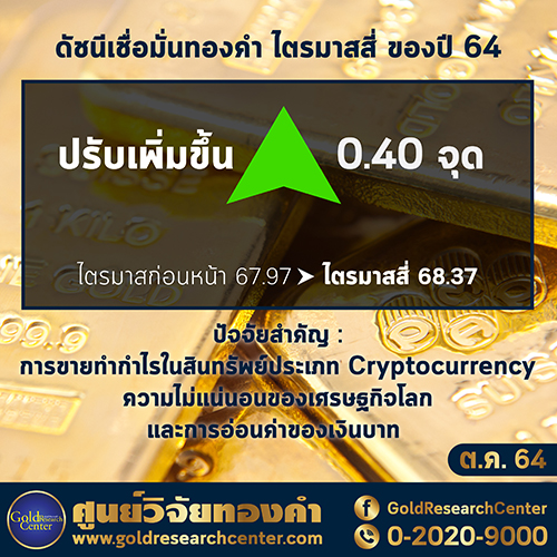 ดัชนีความเชื่อมั่นราคาทองคำระยะสามเดือนในไตรมาสที่ 4 ของปี 2564 (ต.ค.–ธ.ค.) ปรับเพิ่มขึ้นจากไตรมาสสามของปี 2564 จากระดับ 67.97 จุด มาอยู่ที่ระดับ 68.37 จุด เพิ่มขึ้น 0.40 จุด หรือคิดเป็น 0.59% โดยดัชนีฯ ที่ปรับเพิ่มขึ้นมานั้น น่าจะมีสาเหตุมาจาก การขายทำกำไรในสินทรัพย์ประเภท Cryptocurrency ความไม่แน่นอนของเศรษฐกิจโลก และการอ่อนค่าของเงินบาท