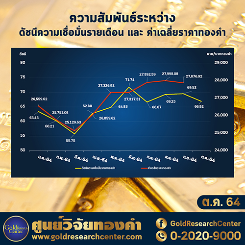 ดร.พิบูลย์ฤทธิ์ วิริยะผล แถลงดัชนีความเชื่อมั่นราคาทองคำประจำเดือน ตุลาคม 2564 ปรับลดลงเมื่อเทียบกับเดือน กันยายน 2564 ที่ผ่านมา จากระดับ 69.52 จุด มาอยู่ที่ระดับ 66.92 จุด ลดลง 2.60 จุด หรือคิดเป็น 3.75% โดยปัจจัยที่ทำให้ดัชนีฯ ปรับลดลงมานั้นมาจากการกระจายวัคซีนต้านไวรัส COVID-19 มีประสิทธิภาพในการควบคุมโรคสูง อัตราผลตอบแทนพันธบัตรสหรัฐฯ ปรับตัวสูงขึ้น และการลดนโยบายผ่อนคลายทางการเงินของธนาคารกลางสหรัฐฯ (FED)