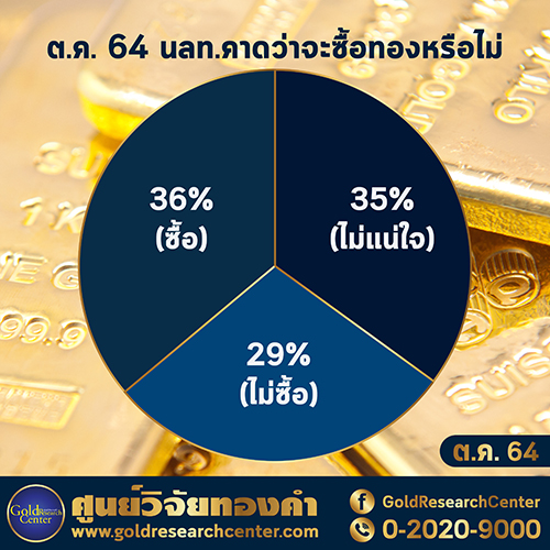 คาดการณ์ความต้องการซื้อทองคำในช่วงเดือน ตุลาคม 2564 จากกลุ่มตัวอย่างจำนวน 348 ตัวอย่าง พบว่า 36% จะซื้อทองคำในเดือนนี้ ขณะที่ 35% ไม่แน่ใจว่าจะซื้อทองคำ หรือไม่ และอีก 29% ยังไม่ซื้อทองคำ