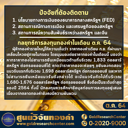 การลงทุนทองคำในเดือน ตุลาคม 2564 ผู้ค้าทองคำรายใหญ่ให้ความเห็นว่า ราคาทองคำเดือน กันยายน ที่ผ่านมาเคลื่อนไหวอยู่ภายในกรอบ โดยมุมมองต่อราคาทองคำในเดือนนี้ มองว่าหากราคาทองไม่สามารถยืนเหนือแนวต้านที่บริเวณ 1,833 ดอลลาร์สหรัฐฯ ต่อทรอยออนซ์ได้ คาดว่าราคาทองจะค่อยๆ ขยับลงทดสอบแนวรับแรกที่บริเวณ 1,698 ดอลลาร์สหรัฐฯ ต่อทรอยออนซ์ และหากไม่สามารถยืนเหนือแนวรับดังกล่าวได้ จะมีแนวรับถัดไปที่บริเวณ 1,680-1,676 ดอลลาร์สหรัฐฯ ต่อทรอยออนซ์ ซึ่งถือเป็นระดับต่ำสุดของปี 2564 ทั้งนี้ นักลงทุนควรศึกษาข้อมูลก่อนการลงทุนอยู่เสมอ เนื่องจากตลาดทองคำยังคงมีความผันผวน