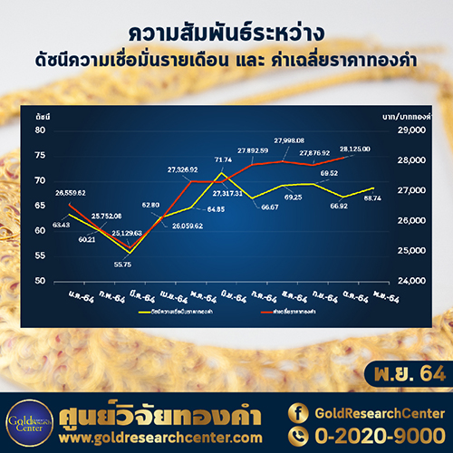 ดร.พิบูลย์ฤทธิ์ วิริยะผล ผู้อำนวยการศูนย์วิจัยทองคำ แถลงดัชนีความเชื่อมั่นราคาทองคำประจำเดือน พฤศจิกายน 2564 ปรับเพิ่มขึ้นเมื่อเทียบกับเดือน ตุลาคม 2564 ที่ผ่านมา จากระดับ 66.92 จุด มาอยู่ที่ระดับ 68.74 จุด เพิ่มขึ้น 1.82 จุด หรือคิดเป็น 2.72% โดยปัจจัยที่ทำให้ดัชนีฯ ปรับเพิ่มขึ้นมานั้น มาจากการปรับเพิ่มขึ้นของราคาน้ำมัน ความกังวลเรื่องเงินเฟ้อในสหรัฐฯ การอ่อนค่าของเงินบาทหนุนราคาทองในประเทศ และความต้องการซื้อสินทรัพย์ปลอดภัย
