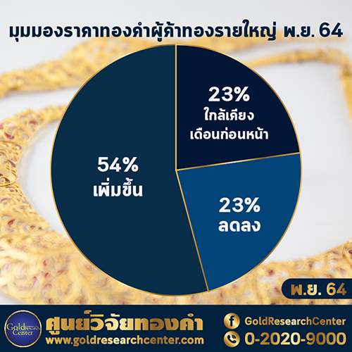 สรุปกลุ่มตัวอย่างที่เป็นผู้ประกอบกิจการค้าทองคำรายใหญ่และผู้ประกอบกิจการนายหน้าซื้อขายสัญญาซื้อขายล่วงหน้าที่อ้างอิงกับราคาทองคำ จำนวน 13 ตัวอย่าง โดยส่วนใหญ่เชื่อว่าราคาทองคำในเดือน พฤศจิกายน 2564 จะเพิ่มขึ้น มีจำนวน 7 ราย และคาดว่าจะลดลง มีจำนวน 3 ราย ส่วนที่คาดว่าใกล้เคียงกับราคาทองคำในเดือน ตุลาคม 2564 มีจำนวน 3 ราย