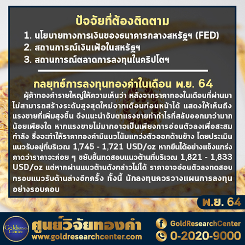 การลงทุนทองคำในเดือน พฤศจิกายน 2564 ผู้ค้าทองคำรายใหญ่ให้ความเห็นว่า หลังจากราคาทองในเดือนที่ผ่านมาไม่สามารถสร้างระดับสูงสุดใหม่จากเดือนก่อนหน้าได้ แสดงให้เห็นถึงแรงขายที่เพิ่มสูงขึ้น จึงแนะนำจับตาแรงขายทำกำไรที่สลับออกมาว่ามากน้อยเพียงใด หากแรงขายไม่มากอาจเป็นเพียงการอ่อนตัวลงเพื่อสะสมกำลัง ซึ่งจะทำให้ราคาทองคำมีแนวโน้มแกว่งตัวออกด้านข้าง โดยประเมินแนวรับอยู่ที่บริเวณ 1,745 – 1,721 ดอลลาร์สหรัฐฯ ต่อออนซ์ หากยืนได้อย่างแข็งแกร่ง คาดว่าราคาจะค่อย ๆ ขยับขึ้นทดสอบแนวต้านที่บริเวณ 1,821 – 1,833 ดอลลาร์สหรัฐฯ ต่อออนซ์ แต่หากผ่านแนวต้านดังกล่าวไม่ได้ราคาอาจอ่อนตัวลงทดสอบกรอบแนวรับด้านล่างอีกครั้ง ทั้งนี้ นักลงทุนควรวางแผนการลงทุนอย่างรอบครอบ