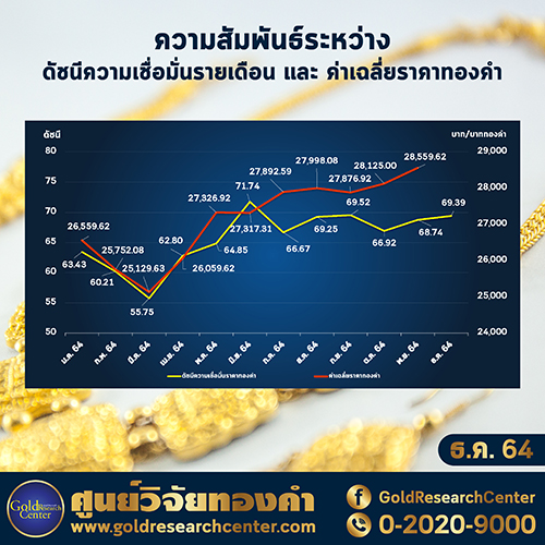 ดร.พิบูลย์ฤทธิ์ วิริยะผล ผู้อำนวยการศูนย์วิจัยทองคำ แถลงดัชนีความเชื่อมั่นราคาทองคำประจำเดือน ธันวาคม 2564 ปรับเพิ่มขึ้นมาเล็กน้อยเมื่อเทียบกับเดือน พฤศจิกายน 2564 ที่ผ่านมา จากระดับ 68.74 จุด มาอยู่ที่ระดับ 69.39 จุด เพิ่มขึ้น 0.65 จุด หรือคิดเป็น 0.94% โดยปัจจัยที่ทำให้ดัชนีฯ ปรับเพิ่มขึ้นมานั้นเกิดจาก ความต้องการซื้อสินทรัพย์ปลอดภัย สถานการณ์การแพร่ระบาดของเชื้อไวรัส COVID-19 สายพันธุ์ใหม่ และความกังวลเรื่องเงินเฟ้อในสหรัฐฯ