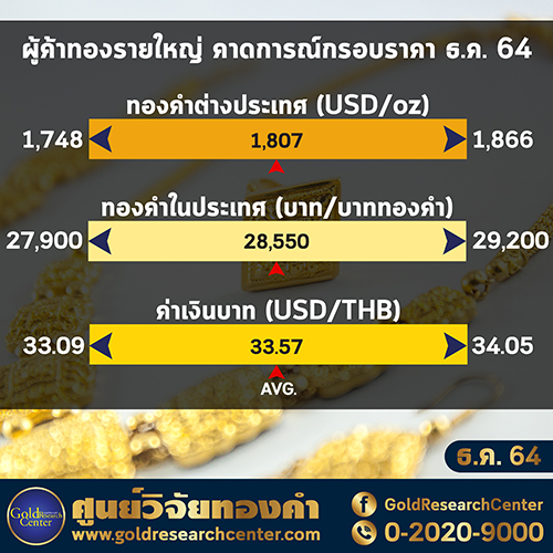 สำหรับการคาดการณ์ราคาทองคำในเดือน ธันวาคม 2564 ของผู้ประกอบกิจการค้าทองคำรายใหญ่มีมุมมอง ดังนี้ Gold Spot ให้กรอบเฉลี่ยบริเวณ 1,748 – 1,866 ดอลลาร์สหรัฐฯ ต่อออนซ์ ด้านราคาทองคำแท่งในประเทศความบริสุทธิ์ 96.5% ให้กรอบเฉลี่ยบริเวณ 27,900 – 29,200 บาทต่อน้ำหนัก 1 บาททองคำ และด้านค่าเงินบาท ให้กรอบเฉลี่ยบริเวณ 33.09 – 34.05 บาท ต่อ 1 ดอลลาร์สหรัฐฯ
