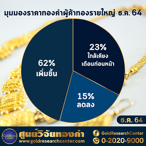 สรุปกลุ่มตัวอย่างที่เป็นผู้ประกอบกิจการค้าทองคำรายใหญ่และผู้ประกอบกิจการนายหน้าซื้อขายสัญญาซื้อขายล่วงหน้าที่อ้างอิงกับราคาทองคำ จำนวน 13 ตัวอย่าง โดยส่วนใหญ่เชื่อว่าราคาทองคำในเดือน ธันวาคม 2564 จะเพิ่มขึ้น มีจำนวน 8 ราย และคาดว่าใกล้เคียงกับราคาทองคำในเดือน พฤศจิกายน 2564 มีจำนวน 3 ราย ส่วนที่คาดว่าจะลดลง มีจำนวน 2 ราย