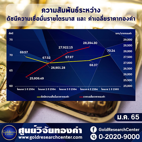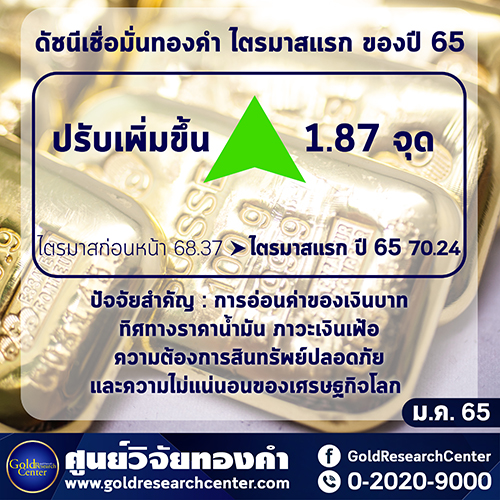 ดัชนีความเชื่อมั่นราคาทองคำระยะสามเดือนในไตรมาสแรกของปี 2565 (ม.ค.–มี.ค.) ปรับเพิ่มขึ้นจากไตรมาสสุดท้ายของปี 2564 จากระดับ 68.37 จุด มาอยู่ที่ระดับ 70.24 จุด เพิ่มขึ้น 1.87 จุด หรือคิดเป็น 2.47% โดยดัชนีฯ ปรับเพิ่มขึ้นมาเนื่องจาก การอ่อนค่าของเงินบาท ภาวะเงินเฟ้อ และความต้องการซื้อสินทรัพย์ปลอดภัย