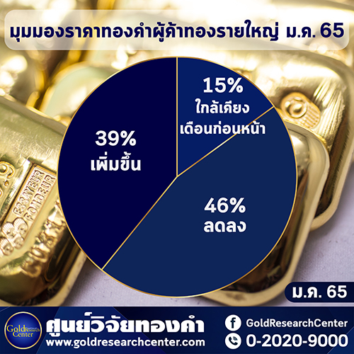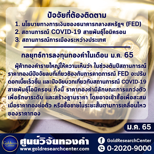 การลงทุนทองคำในเดือน มกราคม 2565 ผู้ค้าทองคำรายใหญ่ให้ความเห็นว่า ในช่วงต้นปีสถานการณ์ราคาทองมีปัจจัยลบที่เกี่ยวข้องกับการคาดการณ์ FED จะปรับดอกเบี้ยเร็วขึ้น และปัจจัยบวกเกี่ยวกับสถานการณ์ COVID-19 สายพันธุ์ โอมิครอน ทั้งนี้ ราคาทองคำมีลักษณะการแกว่งตัวเพื่อรักษาระดับ และสร้างฐานราคา โดยอาจเข้าซื้อเพื่อสะสมเมื่อราคาทองย่อตัว หรือซื้อขายในระยะสั้นตามการเคลื่อนไหวของราคาทอง