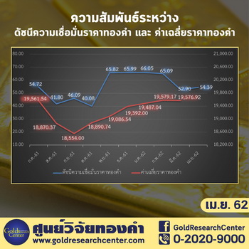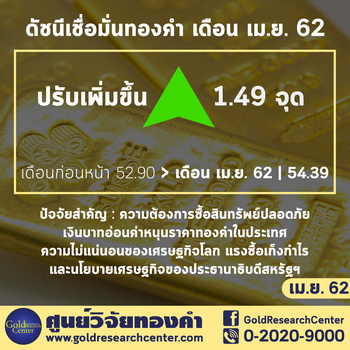 ดร.พิบูลย์ฤทธิ์ วิริยะผล แถลงดัชนีความเชื่อมั่นราคาทองคำเดือน เมษายน 2562 ปรับเพิ่มขึ้นจากเมื่อเดือน มีนาคม ที่ผ่านมา จากระดับ 52.90 จุด มาอยู่ที่ระดับ 54.39 จุด เพิ่มขึ้น 1.49 จุด หรือคิดเป็น 2.82% ส่วนดัชนีความเชื่อมั่นราคาทองคำระยะสามเดือนในไตรมาสที่ 2 ของปี 2562 (เม.ย. – มิ.ย.) ปรับลดลงจากไตรมาสแรกของปี 2562 จากระดับ 59.32 จุด มาอยู่ที่ระดับ 47.79 จุด ลดลง 11.53 จุด หรือคิดเป็น 19.44%