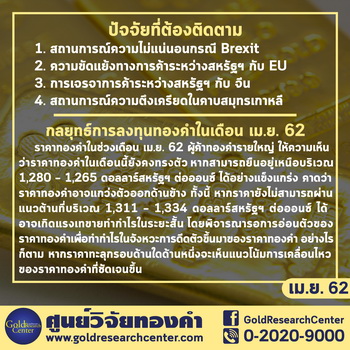 การลงทุนทองคำในเดือน เมษายน 2562 ผู้ค้าทองคำรายใหญ่ ให้ความเห็นว่า ราคาทองคำในเดือนนี้ยังคงทรงตัว หากสามารถยืนอยู่เหนือบริเวณ 1,280 – 1,265 ดอลลาร์สหรัฐฯ ต่อออนซ์ได้ คาดว่าราคาทองคำอาจแกว่งตัวออกด้านข้าง ทั้งนี้ หากราคายังไม่สามารถผ่านแนวต้านที่บริเวณ 1,311 – 1,334 ดอลลาร์สหรัฐฯ ต่อออนซ์ได้ อาจเกิดแรงเทขายทำกำไรในระยะสั้น