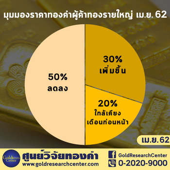 สำหรับการคาดการณ์ราคาทองคำเดือน เมษายน 2562 ของผู้ประกอบกิจการค้าทองคำรายใหญ่มีมุมมองดังนี้ Gold Spot ให้กรอบเฉลี่ยบริเวณ 1,270 – 1,328 ดอลลาร์สหรัฐฯ ต่อออนซ์ ด้านราคาทองคำแท่งในประเทศความบริสุทธิ์ 96.5% ให้กรอบเฉลี่ยบริเวณ 19,150 – 19,850 บาท ต่อน้ำหนัก 1 บาททองคำ และด้านค่าเงินบาทไทย ให้กรอบเฉลี่ยบริเวณ 31.49 – 32.08 บาทไทย ต่อดอลลาร์