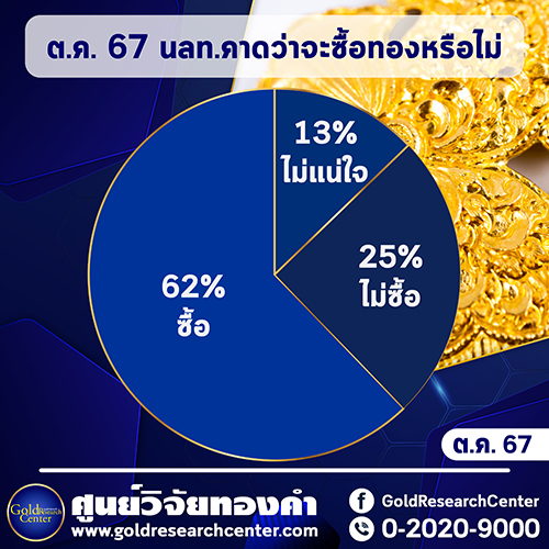 คาดการณ์ความต้องการซื้อทองคำในช่วงเดือน ตุลาคม 2567 จากกลุ่มตัวอย่างจำนวน 320 ราย ในจำนวนนี้มี 200 ราย หรือเทียบเป็น 62% คาดว่าจะซื้อทองคำ ส่วนจำนวน 80 ราย หรือเทียบเป็น 25% คาดว่าจะไม่ซื้อทองคำ และจำนวน 40 ราย หรือเทียบเป็น 13% ไม่แน่ใจว่าจะซื้อทองคำในเดือนนี้หรือไม่