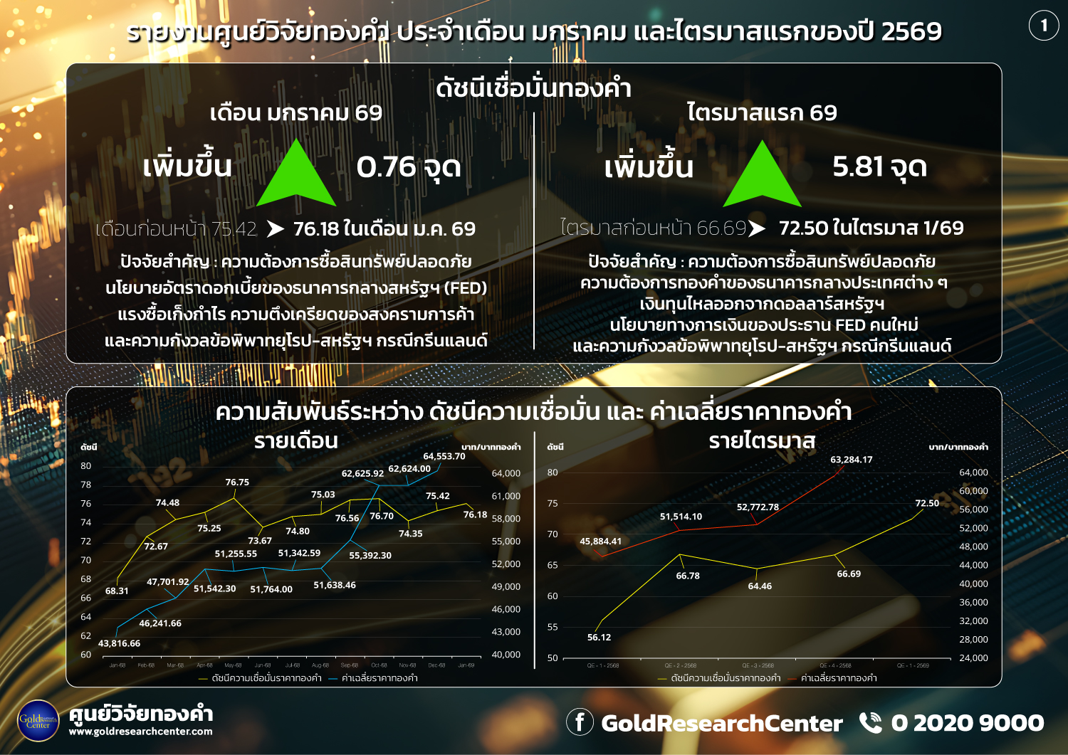 ดัชนีความเชื่อมั่นราคาทองคำระยะสามเดือนในไตรมาสแรกของปี 2569 (ม.ค.–มี.ค.) ปรับเพิ่มขึ้นจากไตรมาสที่ 4 ของปี 2568 จากระดับ 66.69 จุด มาอยู่ที่ระดับ 72.50 จุด เพิ่มขึ้น 5.81 จุด หรือคิดเป็น 8.71%