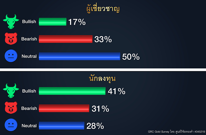 สำหรับ 12 ผู้เชี่ยวชาญในตลาดทองคำที่ได้มีส่วนร่วมตอบแบบสำรวจ ในจำนวนนี้มี 2 ราย หรือเทียบเป็น 17% คาดว่าราคาทองคำในสัปดาห์หน้าจะปรับเพิ่มขึ้น ส่วนจำนวน 4 ราย หรือเทียบเป็น 33% คาดว่าราคาทองคำจะลดลง และ จำนวน 6 ราย หรือเทียบเป็น 50% คาดว่าราคาทองคำจะใกล้เคียงกับสัปดาห์ที่ผ่านมา