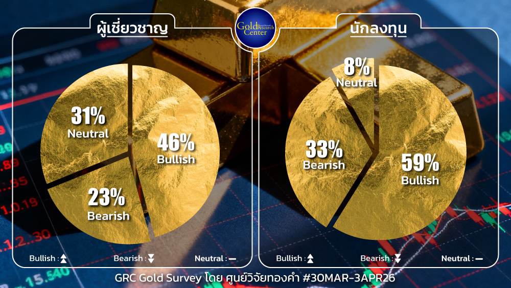 ผลสำรวจมุมมองต่อทิศทางราคาทองคำในประเทศรายสัปดาห์ระหว่างวันที่ 30 มี.ค.-3 เม.ย.2569 จากการสำรวจ GRC Gold Survey โดย ศูนย์วิจัยทองคำ