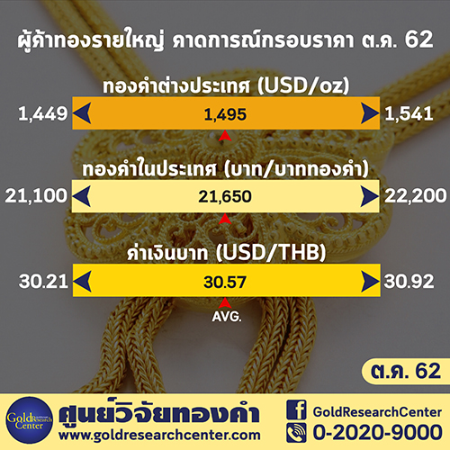 สำหรับการคาดการณ์ราคาทองคำเดือน ตุลาคม 2562 ของผู้ประกอบกิจการค้าทองคำรายใหญ่มีมุมมองดังนี้ Gold Spot ให้กรอบเฉลี่ยบริเวณ 1,449 – 1,541 ดอลลาร์สหรัฐฯ ต่อออนซ์ ด้านราคาทองคำแท่งในประเทศความบริสุทธิ์ 96.5% ให้กรอบเฉลี่ยบริเวณ 21,100 – 22,200 บาท ต่อน้ำหนัก 1 บาททองคำ และด้านค่าเงินบาทไทย ให้กรอบเฉลี่ยบริเวณ 30.21 – 30.92 บาทไทย ต่อดอลลาร์สหรัฐฯ