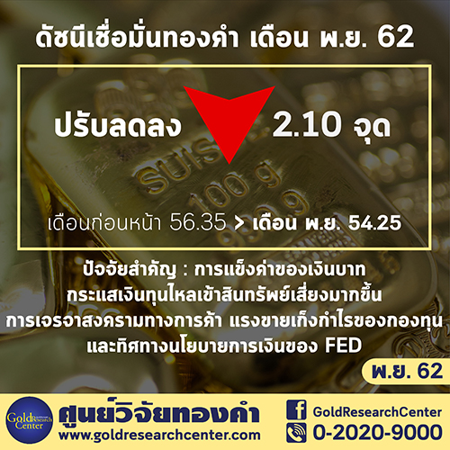 ดร.พิบูลย์ฤทธิ์ วิริยะผล แถลงดัชนีความเชื่อมั่นราคาทองคำประจำเดือน พฤศจิกายน 2562 ปรับลดลงจากระดับ 56.35 มาอยู่ที่ระดับ 54.25 จุด ลดลง 2.10 จุด หรือคิดเป็น 3.73 % โดยปัจจัยที่ทำให้ดัชนีฯ ปรับลดลงมานั้น น่าจะมาจากการแข็งค่าของเงินบาท กระแสเงินทุนไหลเข้าสินทรัพย์เสี่ยงมากขึ้น การเจรจาสงครามทางการค้า และแรงขายเก็งกำไรของกองทุน