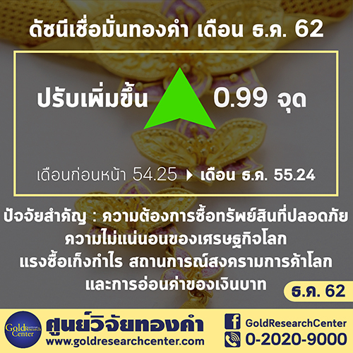 ดร.พิบูลย์ฤทธิ์ วิริยะผล แถลงดัชนีความเชื่อมั่นราคาทองคำประจำเดือน ธันวาคม 2562 ปรับเพิ่มขึ้นจากเดือน พฤศจิกายน ที่ผ่านมา จากระดับ 54.25จุด มาอยู่ที่ระดับ 55.24 จุด เพิ่มขึ้น 0.99 จุด หรือคิดเป็น 1.82% โดยปัจจัยที่ทำให้ดัชนีฯ ปรับเพิ่มขึ้นนั้นมาจากความต้องการซื้อทรัพย์สินที่ปลอดภัย ความไม่แน่นอนของเศรษฐกิจโลก แรงซื้อเก็งกำไร สถานการณ์สงครามการค้าโลก และการอ่อนค่าของเงินบาท ตามลำดับ