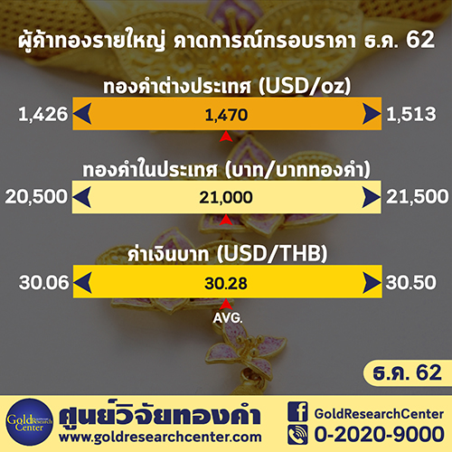 สำหรับการคาดการณ์ราคาทองคำในเดือน ธันวาคม 2562 ของผู้ประกอบกิจการค้าทองคำรายใหญ่มีมุมมองดังนี้ Gold Spot ให้กรอบเฉลี่ยบริเวณ 1,426 – 1,513 ดอลลาร์สหรัฐฯ ต่อออนซ์ ด้านราคาทองคำแท่งในประเทศความบริสุทธิ์ 96.5% ให้กรอบเฉลี่ยบริเวณ 20,500 – 21,500 บาทต่อน้ำหนัก 1 บาททองคำ และด้านค่าเงินบาทให้กรอบเฉลี่ยบริเวณ 30.06 – 30.50 บาท ต่อดอลลาร์สหรัฐฯ