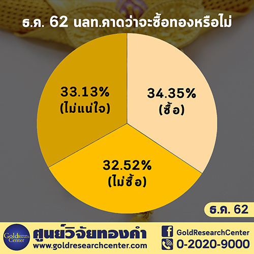 จากกลุ่มตัวอย่างจำนวน 326 ตัวอย่าง พบว่าร้อยละ 34.35 จะซื้อทองคำในช่วงเดือนนี้ ขณะที่ร้อยละ 33.13 ไม่แน่ใจว่าจะซื้อทองคำหรือไม่ และร้อยละ 32.52 คาดว่าจะไม่ซื้อทองคำ
