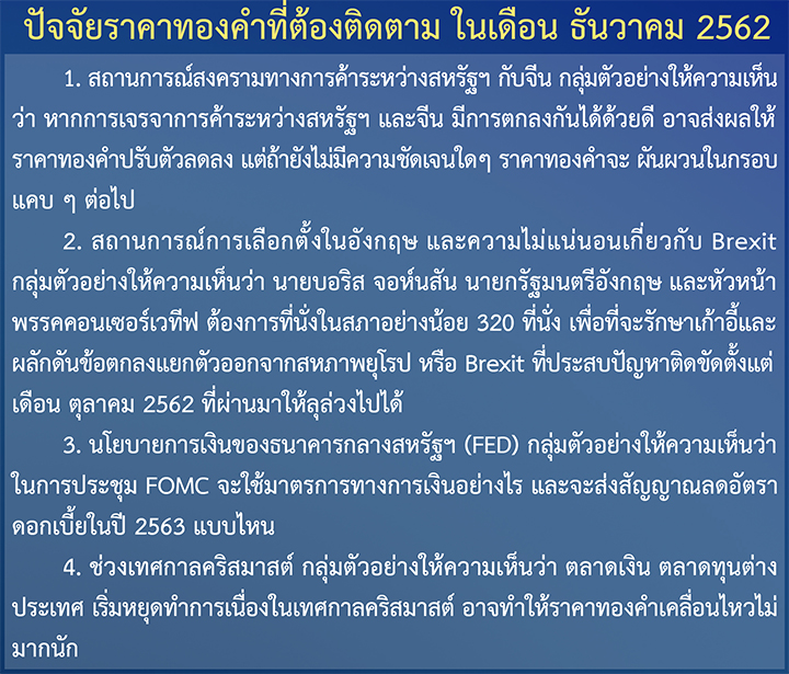 สรุปกลุ่มตัวอย่างที่เป็นผู้ประกอบกิจการค้าทองคำรายใหญ่และผู้ประกอบกิจการนายหน้าซื้อขายสัญญาซื้อขายล่วงหน้าที่อ้างอิงกับราคาทองคำจำนวน 10 ตัวอย่าง โดยส่วนใหญ่เชื่อว่าราคาทองคำในเดือน ธันวาคม 2562 จะเพิ่มขึ้นมีจำนวน 5 ราย และคาดว่าราคาทองคำจะลดลงมีจำนวน 3 ราย ส่วนที่คาดว่าราคาทองคำจะใกล้เคียงกับราคาทองคำในเดือน พฤศจิกายน 2562 มีจำนวน 2 ราย